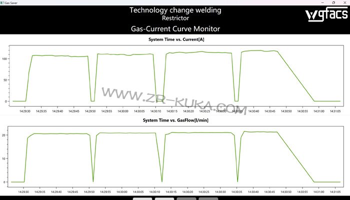 WGFACS節氣裝置的核心設計邏輯,是讓混合氣供給完全跟隨庫卡點焊機器人的電流變化,真正落地按需供給。裝置通過選型與庫卡機器人控制系統對接,不僅能實時捕獲焊接電流數據,還能同步識別焊點周期、焊槍位置及起弧狀態,響應速度達到毫秒級,確保供氣調節與點焊動作精準同步。電流大則多供給混合氣,剛好滿足厚板點焊峰值電流下的焊點保護需求;電流小則同步減少流量,僅維持薄板點焊所需的基礎氣量,從源頭切斷非必要的氣體消耗。