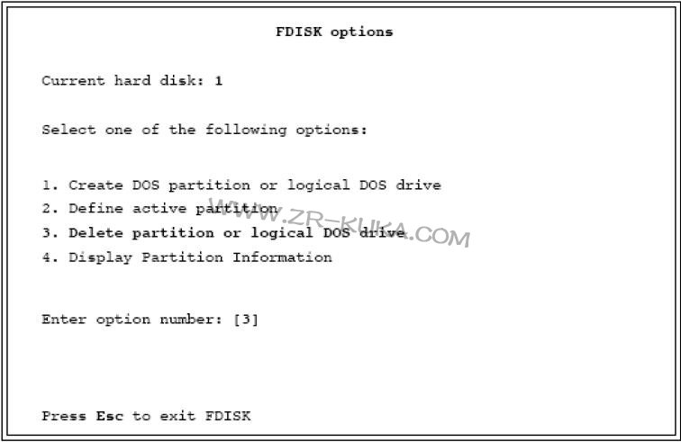 為了刪除分區(qū)或邏輯驅(qū)動器,在 FDISK 選項輸入數(shù)字“3”,用回車鍵確認。與刪除分區(qū)有關