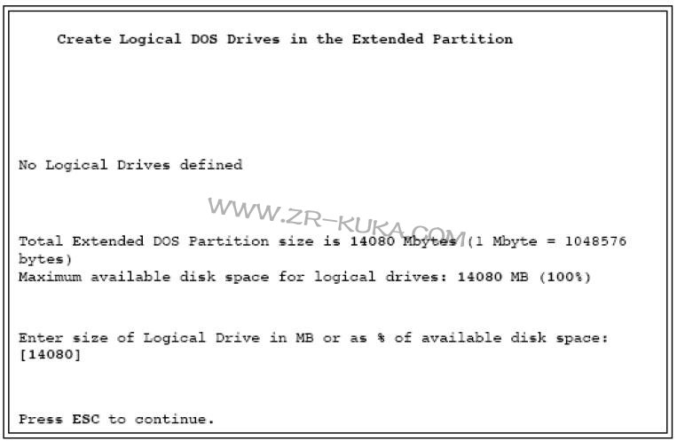 按回車鍵確認想要的大小。按“ESC”鍵返回分區(qū)選項,在哪兒你將定義邏輯驅(qū)動器。