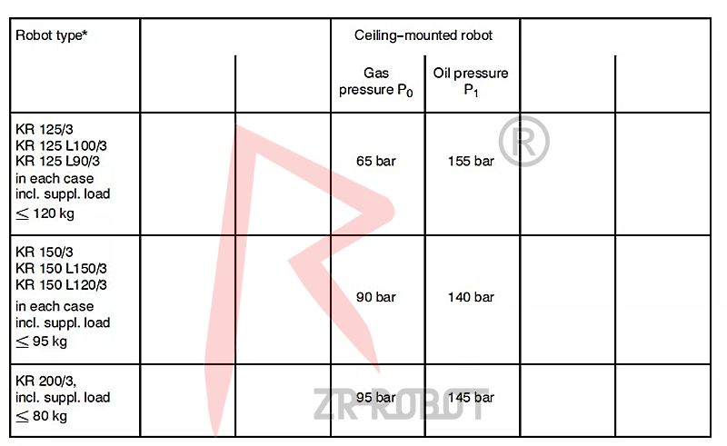 隨著機械臂不斷運行,平衡缸導向套部位需要定期加注一些潤滑脂進行維護。而液氣類需要定期檢查其壓力值,是否低于設定壓力值偏差范圍之內。同時仍然要說明的是平衡缸力矩最小的的地方是機械臂2軸零點位置。不同的機型氣壓和油壓均不相同。需要查看庫卡出廠設定壓力參考手冊。比如如下機型的一些設定壓力范圍: