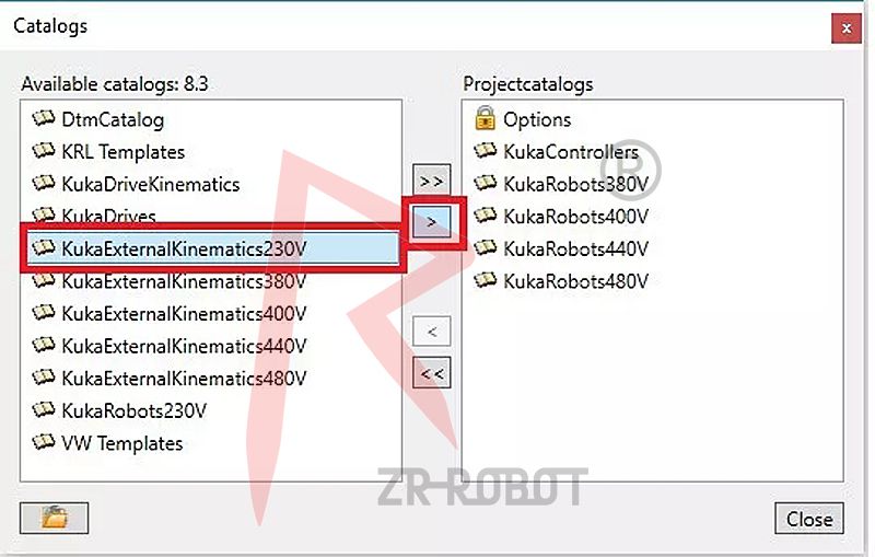 Step2選擇KukaExternalKinematics230V點(diǎn)擊單個(gè)箭頭,添加到現(xiàn)有目錄
