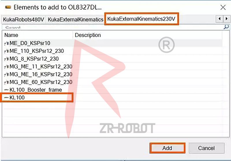 Step4選擇KukaExternalKinematics230V→KL100→Add
