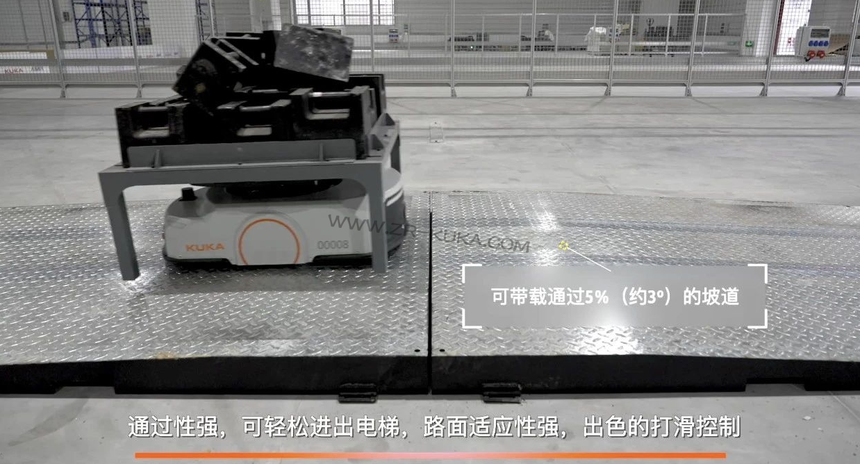 KMP 400P可輕松進出電梯,路面適應性強,具備出色的打滑控制能力,可通過震蕩、濕滑路面。在通過窄道時,可與周邊保持最窄安全距離為5mm。可帶載通過5%(約3°)的坡道,可通過30mm寬的溝和5mm高的坎。