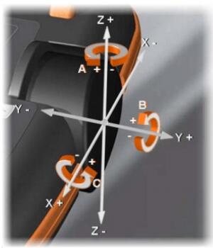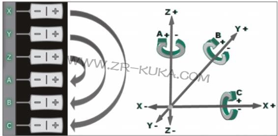 環繞著坐標系的坐標軸方向轉動(旋轉/ 回轉) : 角度 A 、B 和 C 收到一個運行指令時(例如按了移動鍵后)控制器先計算一行程段。該行程段的起點是工具參照點 (TCP) 。行程段的方向由世界坐標系給定。 控制器控制所有軸相應運動,使工具沿該行程段運動(平動)或繞其旋轉(轉動) 。