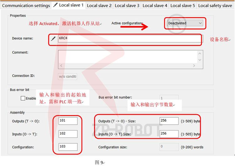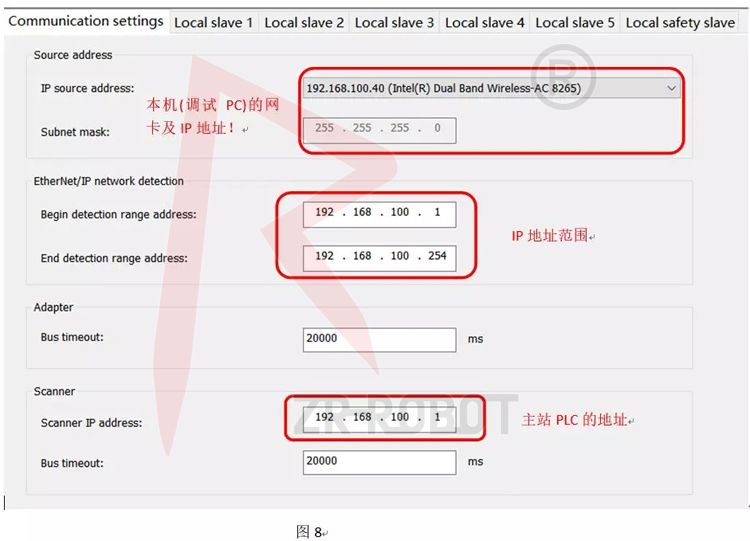 二者通過Ethernet/IP協(xié)議進行通訊:PLC作為Scanner,機器人作Adapter