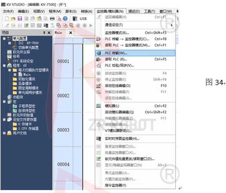 G.回到主界面,如圖34,在監(jiān)控器/模擬器欄選擇PLC傳輸,將新項目上床到PLC控制器,在線監(jiān)控二者數(shù)據(jù)交互是否一致(PLC->Robot,Robot->PLC)