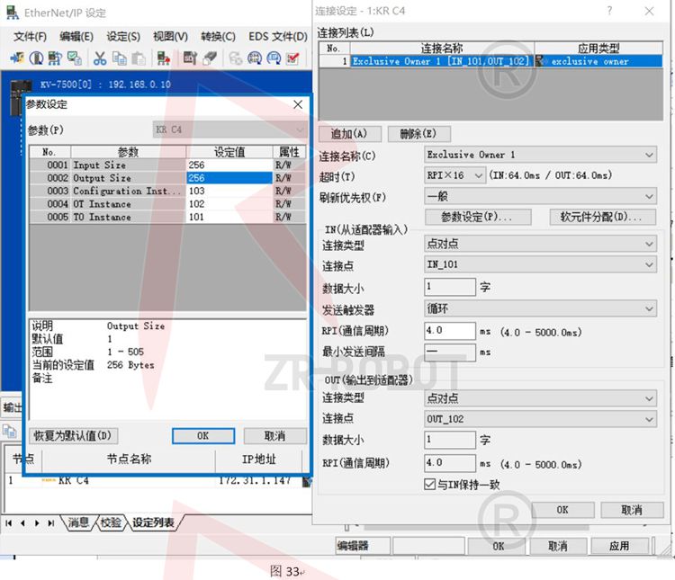F.在如圖33的藍色參數(shù)設定框里設置機器人的參數(shù),如輸入輸出長度,OT/TO背景數(shù)據(jù)(需與機器人端設置一致),完成后點擊OK完成配置;