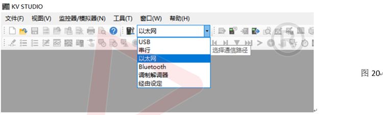A.打開編程配置軟件KVStudio,選擇調(diào)試PC與PLC控制器連接方式如圖20,選擇了以太網(wǎng)(二者IP在同一網(wǎng)段)