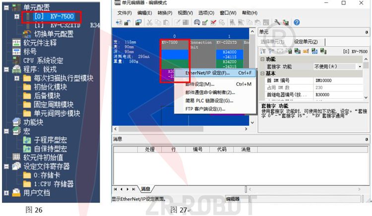 A.在如圖26界面鼠標左鍵雙擊控制器KV-7500(如紅色區(qū)域),進入如圖27的單元編輯欄,鼠標右鍵單擊圖中紅色區(qū)域的PLC控制器KV-7500后,選擇Ethernet/IP設定欄進入Ethernet/IP配置;