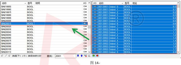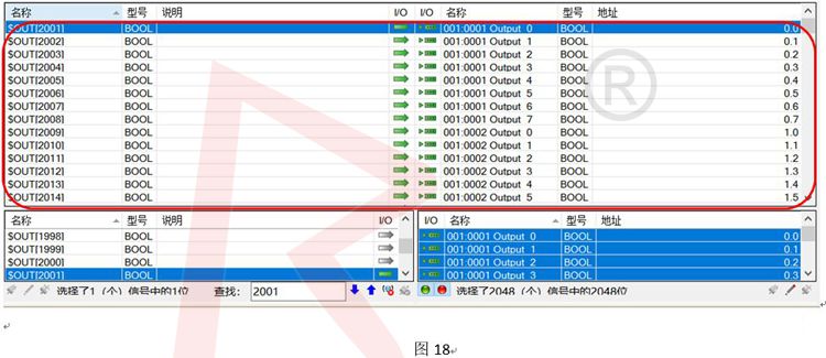 e.圖17界面后,選擇機器人輸出的起始位置,在右邊框里CTRL+A選擇PLC的所有信號后,將其拖拉至左邊機器人的起始位置,如$out[2001],鏈接完成后,可以看到如圖18的紅色區(qū)域,表示映射完成;