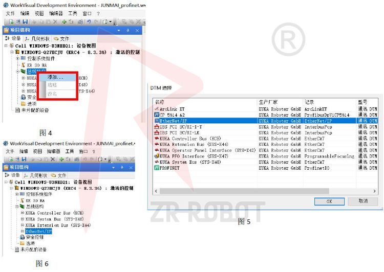 3.右鍵單擊總線結(jié)構,彈出界面如圖4紅色區(qū)域,然后點擊添加彈出圖5圖框,在該框內(nèi)選擇Ethernet/IP并點擊該圖框的OK鍵完成添加,此時可以在總線結(jié)構下面看到Ethernet/IP總線,如圖6所示;