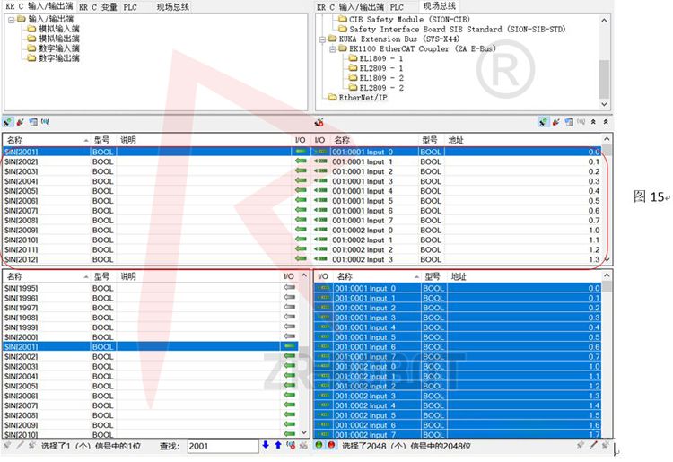 c.分割完后,進入圖14界面后,選擇機器人輸入的起始位置,在右邊框里CTRL+A選擇PLC的所有信號后,將其拖拉至左邊機器人的起始位置,如$IN[2001],鏈接完成后,可以看到如圖15的紅色區(qū)域,表示映射完成;